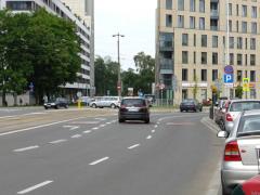 Wydaje się jednak, że obecnie już jest to passe. Najbardziej popularnym sposobem jest po prostu przejazd środkiem między progami. Jest to możliwe dzięki zastosowaniu na tej w zasadzie osiedlowej uliczce pasów ruchu jak na drodze ekspresowej - po 3,5 m w każdą stronę.