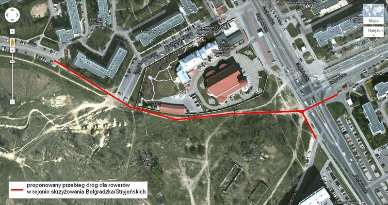 1. Wytyczyć przejazd dla rowerów przez ul. Stryjeńskich; 2. Wybudować łącznik z ul. Moczydłowską oraz łącznik z ulicą osiedlową na tyłach kościoła (dzięki temu ostatniemu - przy użyciu ulic osiedlowych będzie można dojechać do drogi dla rowerów przy ul. Pileckiego.