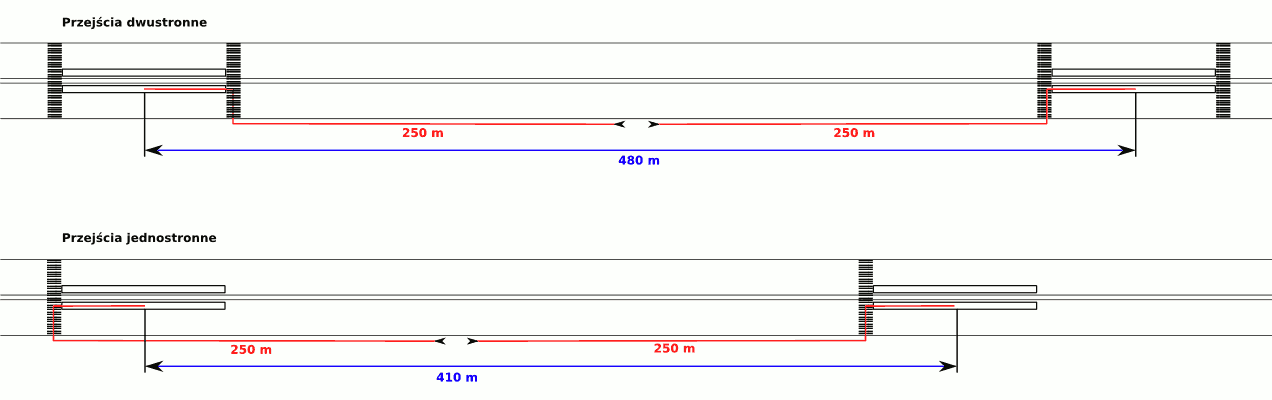 Można też na to spojrzeć z innej strony: przejścia z dwóch stron pozwalają rozmieścić przystanki rzadziej przy zachowaniu takich samych odległości dojścia pieszego. Przykładowo aby zapewnić drogę dojścia do celów wzdłuż ulicy, którą jedzie tramwaj, nie dłuższą niż 250 m, przy przejściach jednostronnych trzeba rozmieścić przystanki co 410 m; przy przejściach dwustronnych wystarczy rozmieszczenie co 480 m. Oczywiście nie zawsze układ skrzyżowań i celów podróży pozwala na taką elastyczność, ale konsekwentne stosowania zasady dojść dwustronnych pozwoliłoby ograniczyć liczbę przystanków o 10-15%, skracając czas jazdy.