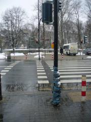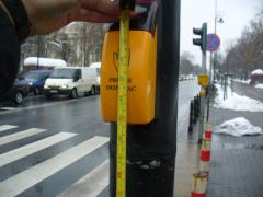 Bez specjalnego entuzjazmu ogłaszamy nowy rekord usytuowania przycisku wzbudzania światła zielonego - 165 cm nad poziomem terenu. Tym samym pokonany został poprzedni rekordzista - przycisk na przejściu przez Waryńskiego przy restauracji Szwejk. O ile przy Szwejku dałoby się to podciągnąć pod jakiś żart, to w tym miejscu raczej ośmieszamy się przed sobą i odwiedzającymi Warszawę turystami.