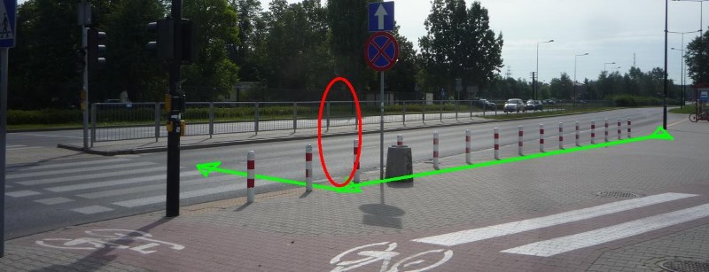 12) Nowoursynowska przy przystankach SGGW-Klinika – przyciski tylko po jednej stronie przejść, brak przycisków od strony przystanków