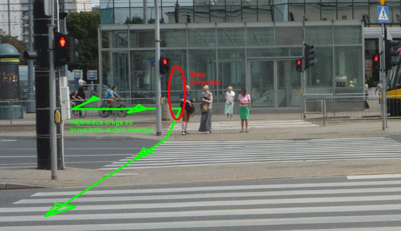 2) przejście przez plac Bankowy przy al. Solidarności [przyciski tylko dla niepełnosprawnych] – brak przycisku od strony Trasy WZ przy wejściu do metra