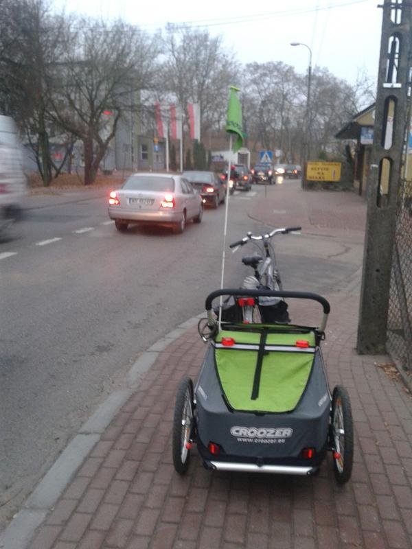 Na tym fragmencie trasy do żłobka nie jadę ulicą, ale chodnikiem. Korka na ulicy doświadczyłbym, gdybym odwoził dzieci samochodem, co pewnie niestety niedługo nastąpi, nie tylko ze względów atmosferycznych.