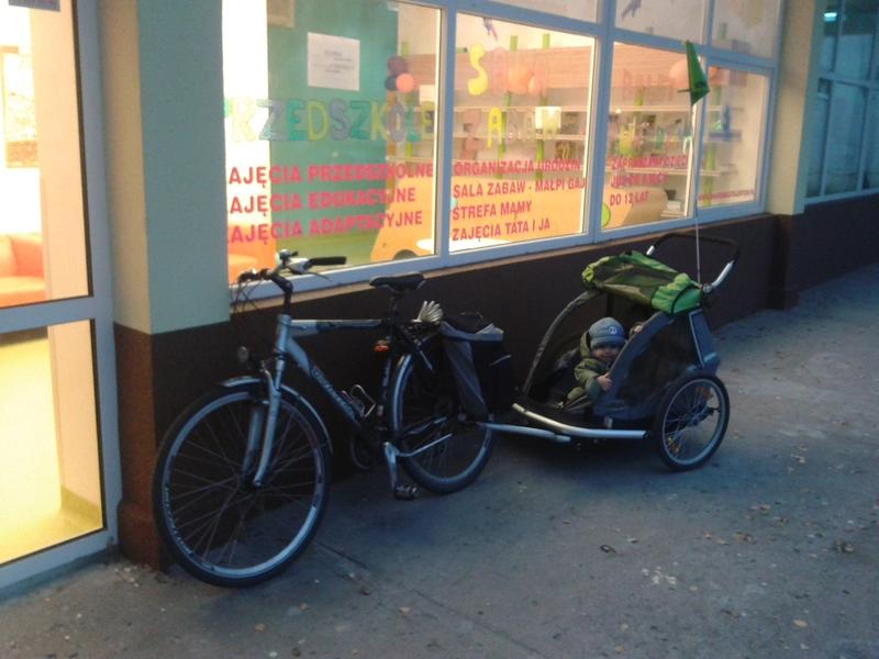 Miłosz już usiłuje wyjść sam z przyczepki pod żłobkiem.