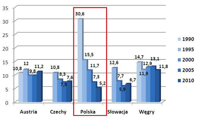 Zmiany udziału kolei w przewozach pasażerskich 5 krajów Europy Centralnej 1990-2010.