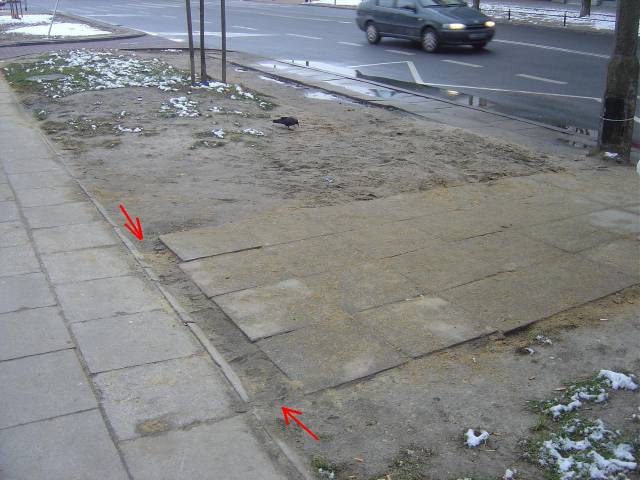 Jedyne ,,wejście'' na przystanek to pas płyt chodnikowych wkopanych wprawdzie, ale bez krawężnika i bez zachowania ciągłości z chodnikiem równoległym do ulicy (strzałki wskazują wyrwę).