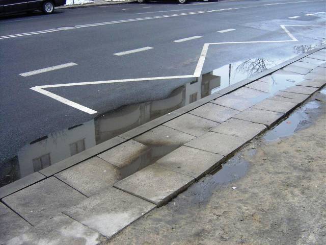 Wadliwe odwodnienie skutkuje dużymi kałużami, które podjeżdżający autobus rozbryzguje na przystanek. Uciekając przed ochlapaniem trzeba przejść na nieutwardzony, niekiedy błotnisty pas ziemi. Płyty tworzą korytko absorbujące wodę zamiast ją odprowadzać.