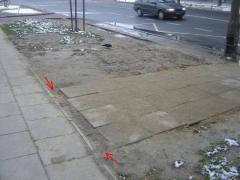 Jedyne ,,wejście'' na przystanek to pas płyt chodnikowych wkopanych wprawdzie, ale bez krawężnika i bez zachowania ciągłości z chodnikiem równoległym do ulicy (strzałki wskazują wyrwę).
