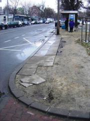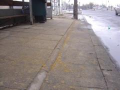 - Wysokość krawężnika nie odpowiada wymaganiom dla dróg tej kategorii oraz przystanków. Paradoksalnie, o ile w poprzek przejść wykonuje się nieprawidłowo wysokie krawężniki, to ten akurat jest przypadkiem odwrotnym - zamiast być wysoki, jest zdecydowanie za niski.