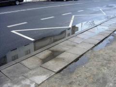 Wadliwe odwodnienie skutkuje dużymi kałużami, które podjeżdżający autobus rozbryzguje na przystanek.