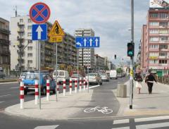 To pierwszy kontrapas dla rowerów w Warszawie. Zaprojektowaliśmy go już w 2002 r. [zobacz >>>], ale zmaterializował się dopiero w 2006 r. [zobacz >>>]. W 2008 r. zdobył drugie miejsce [zobacz >>>] w Konkursie na Dobre Praktyki w kategorii "ruch rowerowy". Przez 4 lata od jego otwarcia nie odnotowano na ulicach Oboźnej i Dynasy żadnego wypadku ani kolizji z udziałem rowerzysty. Swoim funkcjonowaniem zadaje kłam zabobonom [zobacz >>>] o rzekomym niebezpieczeństwie związanym z ruchem rowerów "pod prąd".
