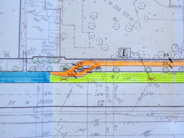 Okolice przystanku ZTM Rzeszotarskiej. Rozdzielenie kierunków ruchu przy przejściu ścieżki z jednej strony szpaleru drzew na drugą pozwala uniknąć konfliktowych sytuacji przy mijaniu się rowerzystów jadących z naprzeciwka.
