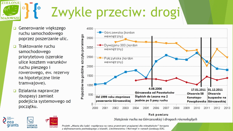 Również ruch samochodowy, czyli podstawowa przyczyna uciążliwości w zakresie niskiej jakości i nieefektywnego wykorzystania przestrzeni, emisji hałasu i szkodliwych substancji, jak też samych zatorów (korków), wciąż jest pobudzany poprzez priorytetowe traktowanie inwestycji w poszerzanie dróg. Komunikacja zbiorowa albo stosowana jest jako działanie naprawcze (pasy dla autobusów na wcześniej poszerzanych drogach) albo jako hipotetyczna przyszłość (rezerwy na tramwaje), zamiast jako rozwiązanie domyślne, które pozwoliłoby zapobiegać problemom zamiast zmuszać do ich późniejszego naprawiania.