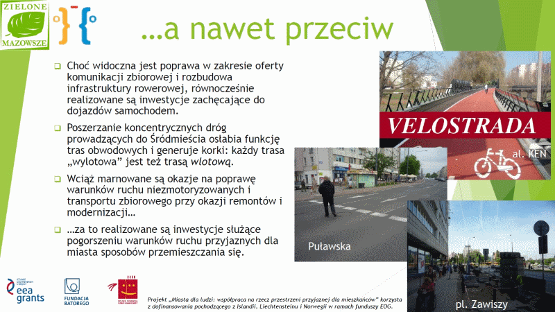 Kolejnym przykładem radykalnej rozbieżności teorii z praktyką jest przedłużenie al. KEN nad Doliną Służewiecką. Jest to trasa służąca wyłącznie omijaniu tras obwodowych i wzmaganiu ruchu samochodowego do centrum miasta. Choć pierwotnie planowana była w tym miejscu Velostrada [zobacz >>>], skończyło się na wiadukcie, na którym nie przewidziano w ogóle miejsca dla rowerzystów ani pieszych. Na końcu ulicy Puławskiej, w obszarze ścisłego Śródmieścia, uznano że równa nawierzchnia trzykrotnie przewymiarowanej jezdni, zachęcająca do niebezpiecznej jazdy [zobacz >>>] jest ważniejsza niż poprawa warunków ruchu niezmotoryzowanych. Również przy okazji remontu chodników przy Al. Jerozolimskich przy placu Zawiszy stwierdzono, że najlepsze warunki do przesiadek powinni mieć... kierowcy kilku parkujących na placu samochodów - aby dojść do przystanków autobusowych w tym węźle przesiadkowym, trzeba przeciskać się półtorametrowym fragmentem chodnika między samochodami a schodami.