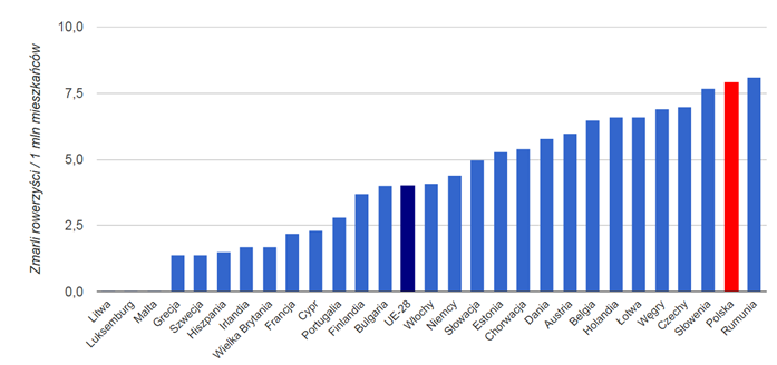 W przeliczeniu na milion mieszkańców, tylko w Rumunii ginie (nieznacznie) więcej rowerzystów.