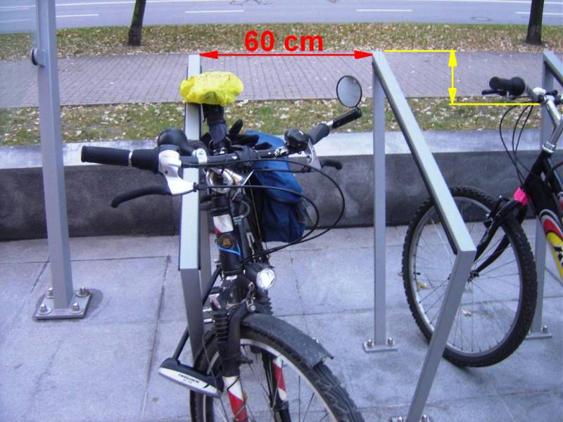 7. Postaraj się bardzo, aby kształt stojaków odbiegał od zalecanego w Standardach(1), powszechnie stosowanego i sprawdzonego wzorca zw. Sheffield . Zamiast zalecanej w Standardach(1) wysokości 60-80 cm, zwiększ ją do 110 cm, aby stojaki kolidowały z kierownicą przeciętnego roweru utrudniając korzystanie ze stojaka i zmuszając do podnoszenia roweru albo nienaturalnego wprowadzania go tyłem. Niech się męczą cyklofile!
