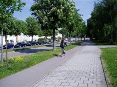 Typowa ścieżka rowerowa w Ratyzbonie - asfaltowa, jednokierunkowa, odróżniająca się od chodnika rodzajem nawierzchni. Znaki - zarówno pionowe jak i poziome - stosowane są bardzo oszczędnie. Na zdjęciu Universitatsstrasse.