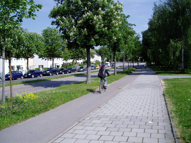 Typowa ścieżka rowerowa w Ratyzbonie - asfaltowa, jednokierunkowa, odróżniająca się od chodnika rodzajem nawierzchni. Znaki - zarówno pionowe jak i poziome - stosowane są bardzo oszczędnie. Na zdjęciu Universitatsstrasse.