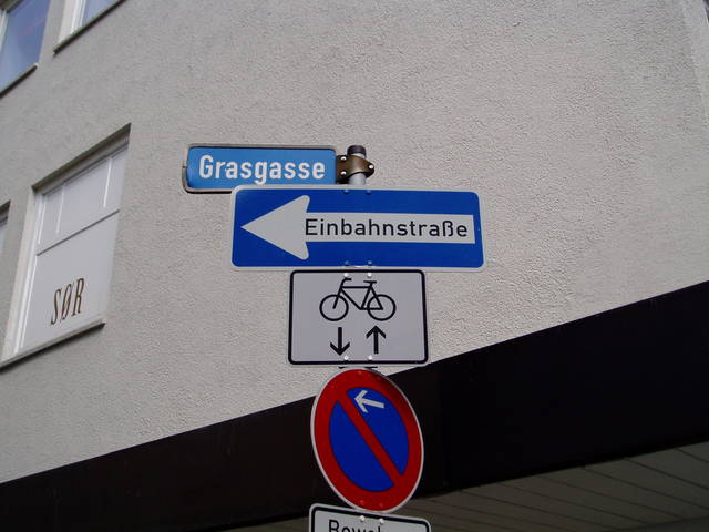 Wiele ulic w śródmieściu jest jednokierunkowych dla samochodów i dwukierunkowych dla rowerów.