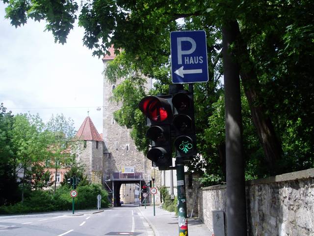 Śluza rowerowa przed Ostentor (Bramą Wschodnią). Na Adolf Schmetzer Strasse zielone światło dla rowerzystów zapala się kilka sekund wcześniej niż dla samochodów, dzięki czemu jako pierwsi wjeżdżają oni w zwężony odcinek drogi pod zabytkową bramą, skutecznie ,,blokując'' ruch.