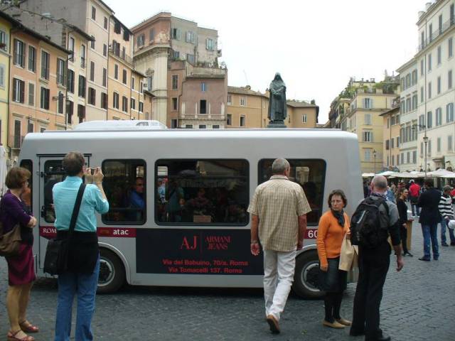 Realizują ją malutkie, 12 osobowe autobusy elektryczne, przedzierające się między innymi pośród stolików pizzerii i kafejek. Pojazdy te są bezgłośne, nie emitują spalin i poruszają się niewiele szybciej od pieszych. Dzięki temu nie są niebezpieczne dla niezmotoryzowanych, nawet w tłumie, nie muszą też mieć parametrów jezdnych wyśrubowanych do "nawiązania walki" na normalnej ulicy. Ot, ruch uspokojony że bardziej nie można. Autobusiki należą oczywiście do miejskiego przedsiębiorstwa komunikacji (atac) i podlegają normalnej taryfie przejazdu.