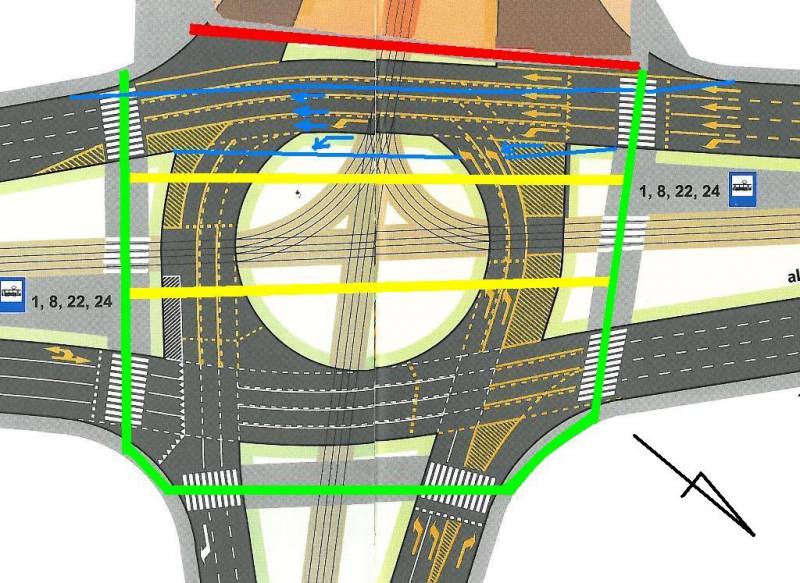 • na niebiesko - możliwość odgięcia pasów w stronę środka ronda by zrobić miejsce pieszym między jezdnią a płotem budowy.