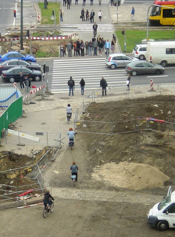 Cztery rowerzystki jakoś przedarły się między placem budowy a biurowcem przy Prostej. Dziś pokonanie tego grzęzawiska dla części osób jest zwyczajnie niewykonalne. Zdjęcie oddaje też dobrze natężenia ruchu pieszych w godzinach szczytu.