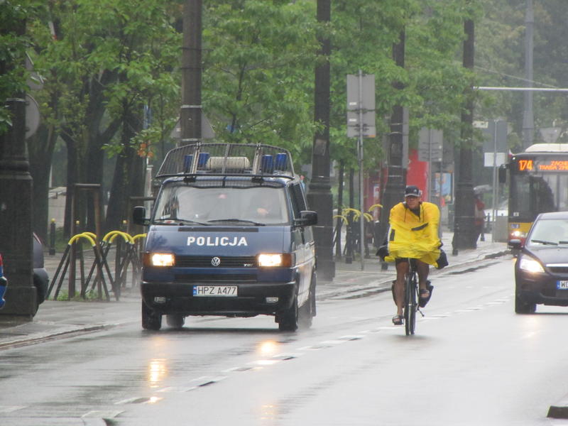 Policja też nie stosuje się do organizacji ruchu, której broni, i radośnie łamie przepisy - radiowóz wyprzedza rowerzystę po buspasie (nie jedzie na sygnale, więc nie jest pojazdem uprzywilejowanym).