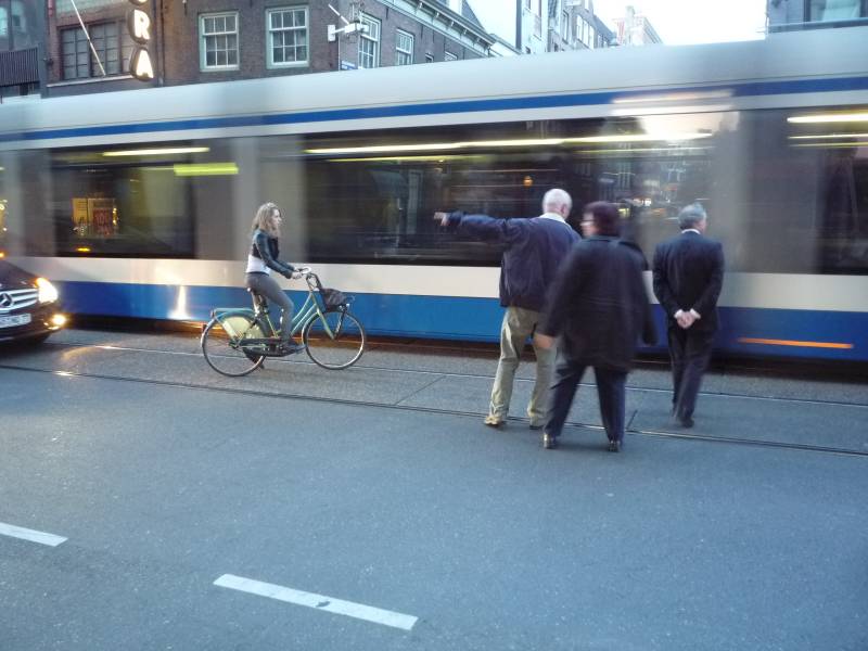 ... lecz czeka, aż on przejedzie. W międzyczasie dołącza do niej grupa przechodniów.