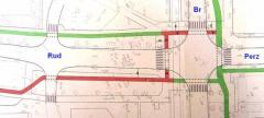 Skrzyżowanie Broniewskiego i Perzyńskiego - dotychczas najbardziej poszkodowane pod względem braków i utrudnień - ma szanse zyskać dwa dodatkowe przejazdy. Dogodna możliwość przejazdu przez wszystkie cztery ramiona wyróżniłaby to miejsce na tle innych skrzyżowań. (Br=Broniewskiego, Perz=Perzyńskiego, Rud=Rudnickiego)