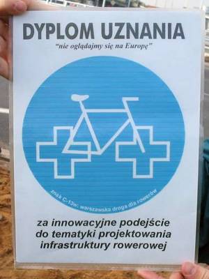 Okolicznościowy dyplom uznania ze znakiem C-13w (warszawska droga dla rowerów), został wręczony wiceprezydent Dorocie Safjan, dyrektorowi ZDM ds. Inwestycji, przedstawicielom projektanta (BAKS) oraz wykonawcy (MPRD).
