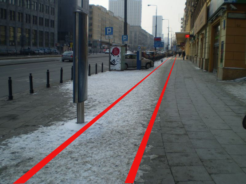 Bezpośrednio za rondem brak parkowania – znaczna szerokość chodnika do wytyczenia drogi dla rowerów.