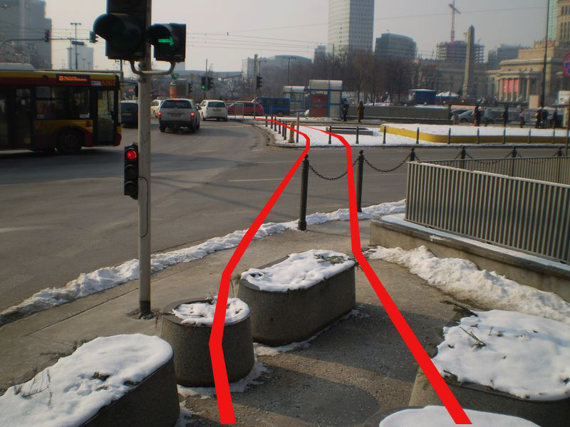 Na odcinku Marszałkowska – Emilii Plater szerokość chodnika jest bardzo duża, dlatego proponuje się drogę dla rowerów dwukierunkową.