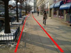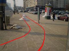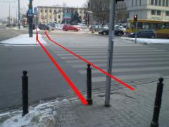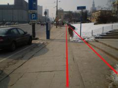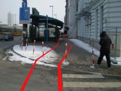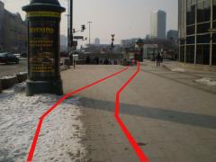 Trasa zaczyna się od wąskiego gardła na wysokości wyjść z przejścia podziemnego. Dla pieszych zostaje nieco ponad 2 m szerokości chodnika.