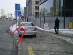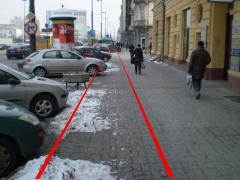 Na odcinku do ul. Poznańskiej jest szerzej, przy 1,5 m szerokości drogi dla rowerów, pozostaje 3 m szerokości chodnika. Miejsca postojowe należy zaprojektować w sposób zapobiegający wjeżdżaniu przez samochody maską na drogę dla rowerów (np. ograniczniki przednich kół) – widać ten problem na zdjęciu.