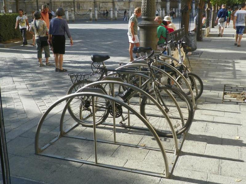 Jeden ze stosowanych w Sewilli stojaków - jednocześnie u-kształtny i przykręcany do podłoża bez konieczności robót budowlanych.