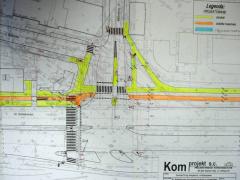 Pierwsza wersja projektu - próba wciśnięcia ścieżki rowerowej w wąski wylot ul. Szwedzkiej przy zachowaniu istniejącego układu świateł i krawężników. Cykliści złapali się za głowy i zaproponowali dwa warianty: