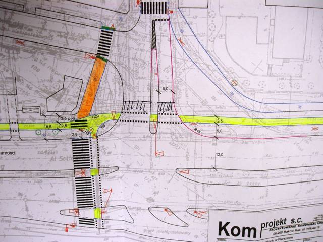 Projektant zaczął rysować wariant optymalny, dodał też zaproponowany na forum przejazd przez Al. Solidarności, ale przy okazji kolejnej Rady Technicznej przypadkiem wyszło na jaw, że był już wcześniej opracowany projekt przebudowy tego skrzyżowania, porządkujący parę innych kwestii.