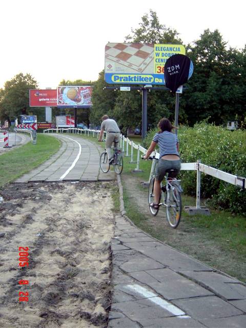 Przez sobotę i niedzielę 27-28 sierpnia - ostatni weekend wakacji - rowerzyści spokojnie mogli jeszcze korzystać z dotychczasowej trasy napotykając tylko w jednym (widocznym na zdjęciu) miejscu na utrudnienie brakiem nawierzchni.