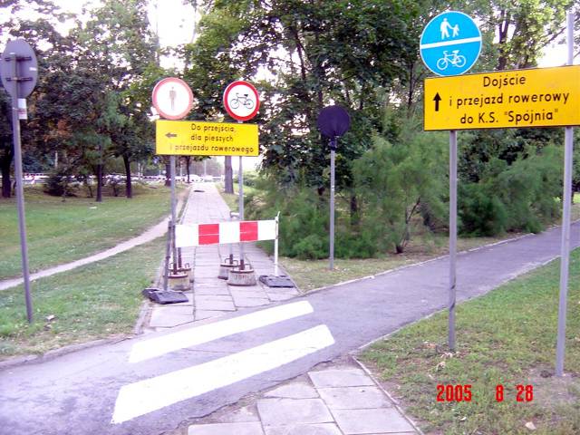 W tym miejscu cofa sie pieszych i rowerzystów do przjścia przy Bramie Straceń Cytadeli, a jednocześnie wskazuje się cel (bo chyba nie płot?), przez który można dostać się do dalszej części traktu.