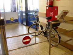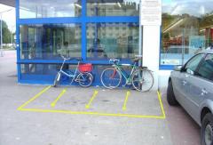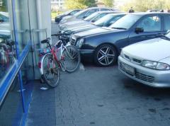 Chciałbym namówić Państwa do poprawienia warunków parkowania rowerów przy sklepie, z którego korzystam. Obecne obejmy na przednie koło roweru znajdujące się na zewnątrz zasobników na wózki nie spełniają niestety swego zadania – nigdy nie widziałem, aby ktoś zaparkował w ten sposób rower. Składa się na to kilka przyczyn. „Gniazdo” na przednie koło nie pozwala przypiąć ramy roweru i pozwala złodziejowi odkręcić oś przedniego koła, pozostawić je na miejscu, a ukraść resztę. Bardziej istotne są dwie kolejne przyczyny. W sytuacji, gdy ładuje się zakupy do koszyka czy sakw na bagażniku, szczególnie istotne staje się stabilne umocowanie zaparkowanego roweru. Rower podparty tylko na przednim kole może się łatwo wywrócić i uszkodzić.