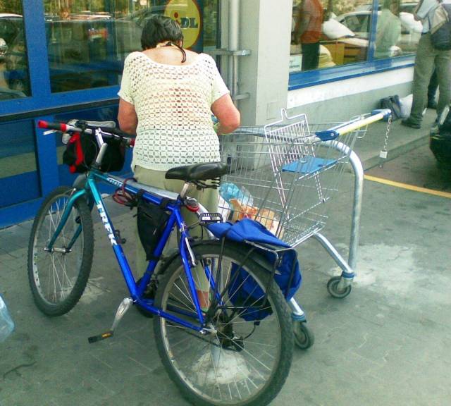 Odpowiednio duże odstępy między stojakami pozwalają podjechać wózkiem do roweru i wygodnie przełożyć zakupy.