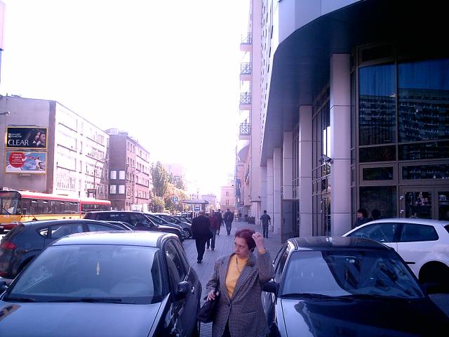 Róg ulicy Żelaznej i Grzybowskiej. Na zdjęciu widać, że możliwość parkowania bez opłat (brak kwitów w samochodach) zachęca też do parkowania w niedozwolonych miejscach.