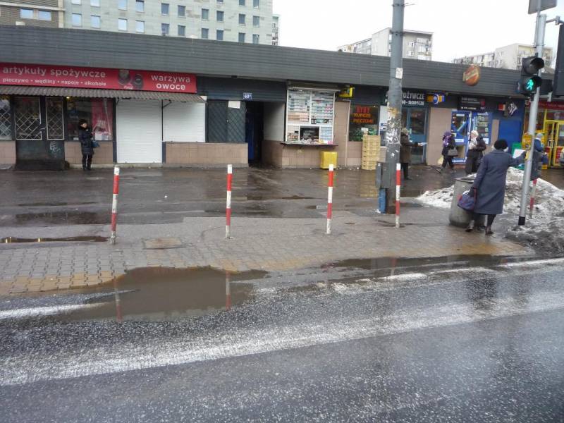 Dotyczy to zarówno kałuży powstających na styku chodnika i jezdni (np. na przejściu przez Al. Jerozolimskie po stronie wschodniej skrzyżowania czy na przejściu przez Raszyńską), jak też odcinków chodnika pomiędzy jezdniami.