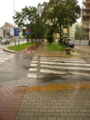 - ryzyko ochlapania przez samochody jadące zalaną jezdnią na odcinku prostopadłym do Korkowej;