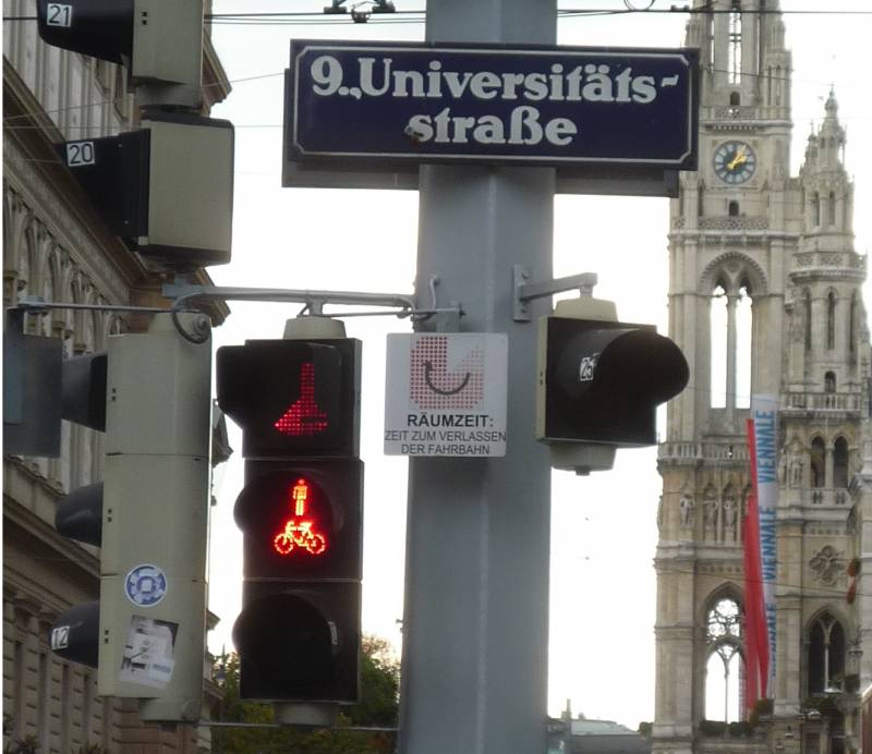 Wskazują nie tylko czas pozostały do zielonego dla pieszych, ale też czas pozostały do zielonego dla samochodów, czyli na ile trzeba się spieszyć po zapaleniu się czerwonego dla pieszych. W tle widoczny ratusz, w którym odbywa się konferencja nt. ruchu pieszego [zobacz >>>].