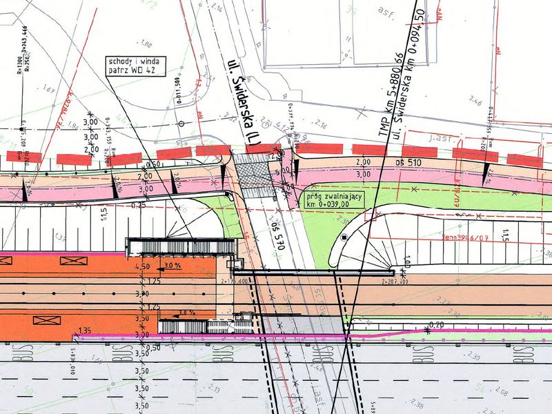 Fragment projektu wykonawczego Trasy Mostu Północnego datowanego na 06.11.2008. Przejazd poprowadzony grzbietem progu zwalniającego.