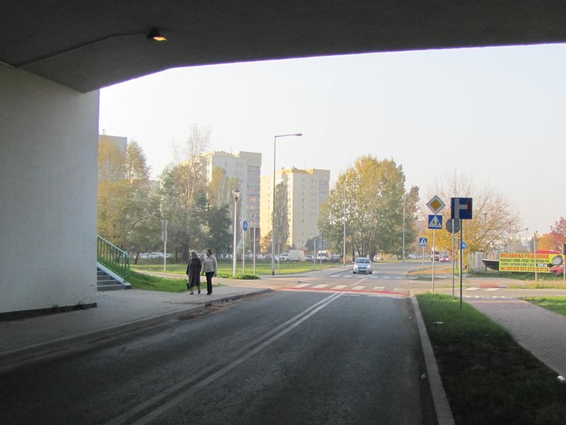 Widok z perspektywy kierowcy. Brak widoczności nadjeżdżających rowerzystów, a geometria jezdni i znak D-1 zachęcają do „dodania gazu”.