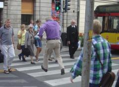 Jedna z żywych reakcji przechodniów na naszą akcję - jeśli dotychczasowy kurs władz miasta dotyczący ruchu pieszego utrzyma się, czeka nas być może zakaz stąpania po czarnych przerwach między pasami, aby piesi nie kalali jezdni należnej złotym cielcom na czterech kołach. A do tego nakaz pokonywania zebry w podskokach - bo przecież pieszy na niej to intruz przeszkadzający płynności ruchu samochodowego i docelowo dla własnego dobra powinien nauczyć się nad nią przefruwać...