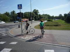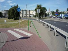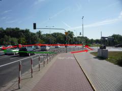 - po zachodniej stronie ww. skrzyżowania, urządzenie przejazdu rowerowego i przejścia dla pieszych nie jest możliwe z uwagi na kolidujące położenie tego przejazdu z ruchem kołowym. Stworzenie warunków bezpiecznego przejazdu uwarunkowane byłoby wprowadzeniem w sygnalizacji świetlnej kolejnej fazy a w konsekwencji do pogorszenia tu niełatwych warunków ruchu.